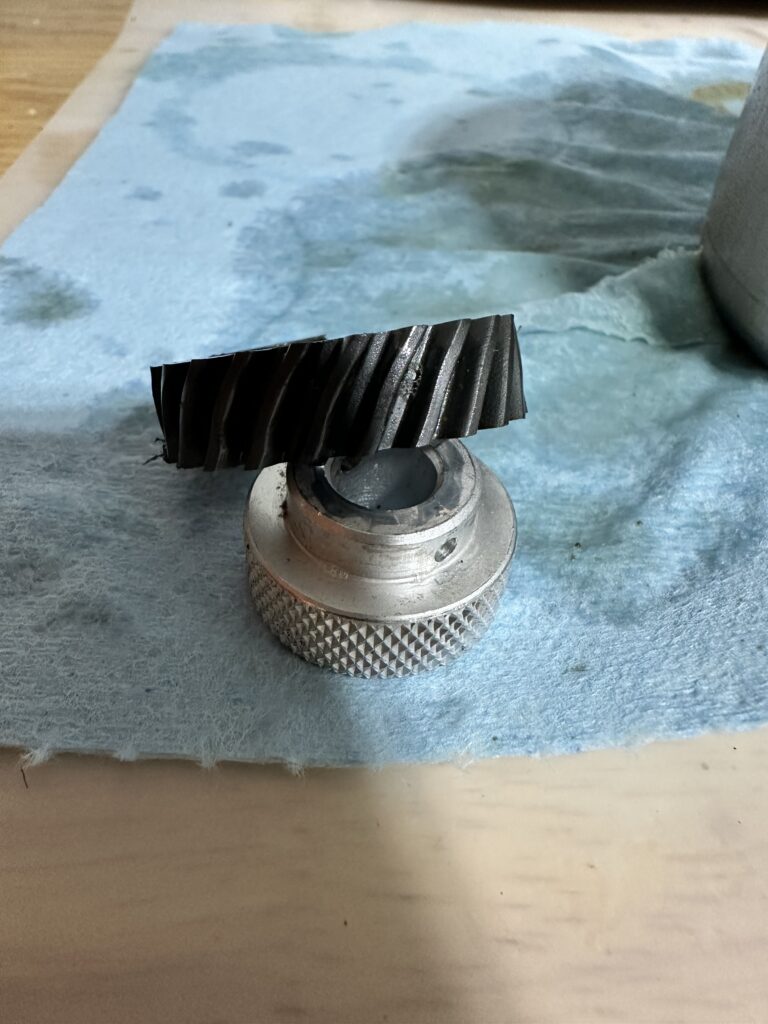 Here’s an example: the “sacrificial” worm follower gear used in K45/K5-type machines. This gear has a nonmetallic helical tooth ring molded on to an aluminum hub.