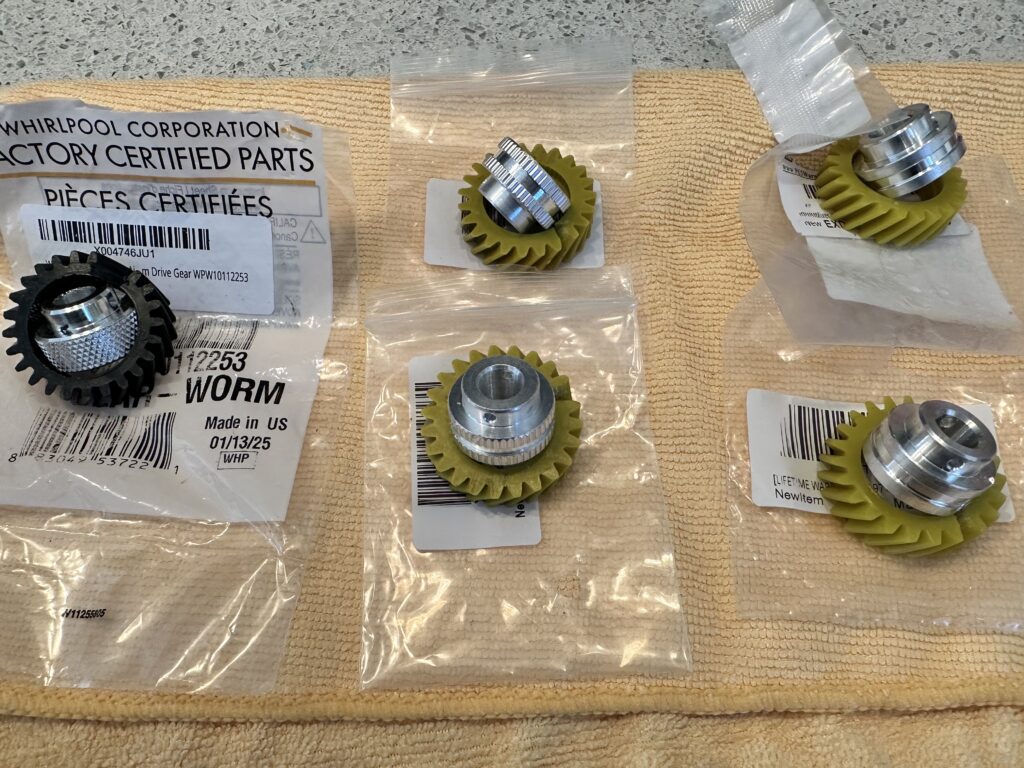 All of these gears attempt to replicate the yellow material that Whirlpool used on these gears for a time. This gives them an appearance of credibility, but as can be seen by their hub design, none of them are made to the factory standard.